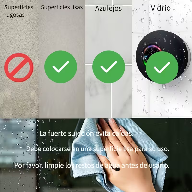 Su conexión Bluetooth 5.0 garantiza una transmisión estable y clara, mientras que su ventosa de montaje permite colocarlo fácilmente en azulejos, espejos o superficies lisas. Además, es recargable por USB y ofrece hasta 2 horas de reproducción continua.