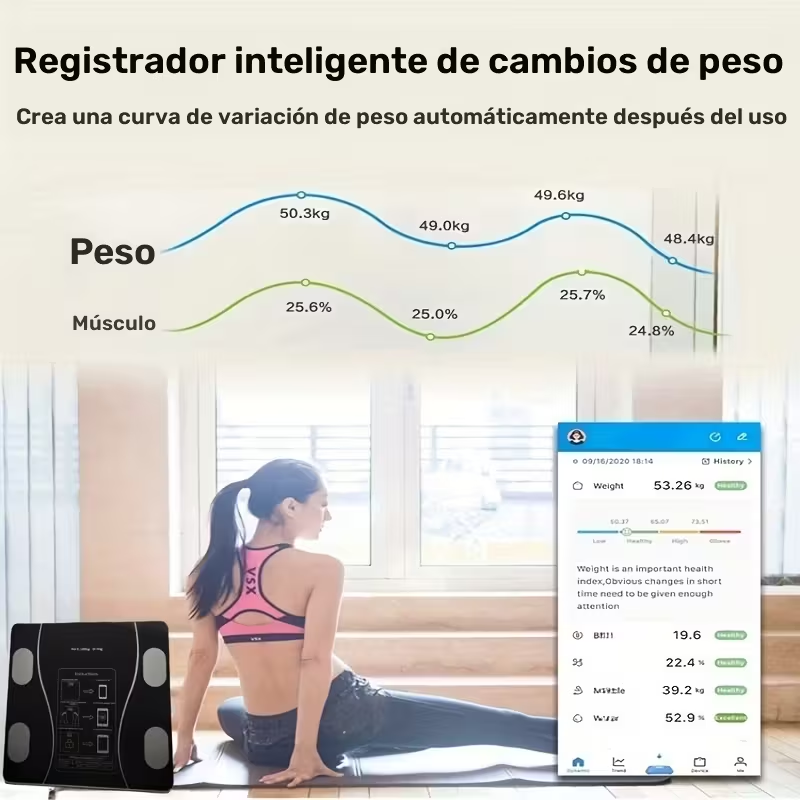 • Medición de peso, grasa corporal, IMC, agua y masa muscular.