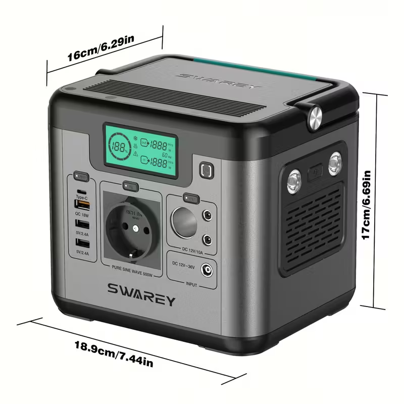 Lleva energía a donde la necesites con la batería portátil SWAREY de 518 Wh, diseñada para ofrecer una fuente de energía confiable y versátil en cualquier situación. Esta estación de energía cuenta con salida AC de 500 W y un puerto USB-C de 65 W, permitiendo cargar múltiples dispositivos a la vez, desde smartphones y laptops hasta electrodomésticos pequeños. Ideal para fiestas, viajes, camping, emergencias o como respaldo en el hogar. Su diseño portátil facilita transportarla y aprovechar la energía solar como fuente sostenible.