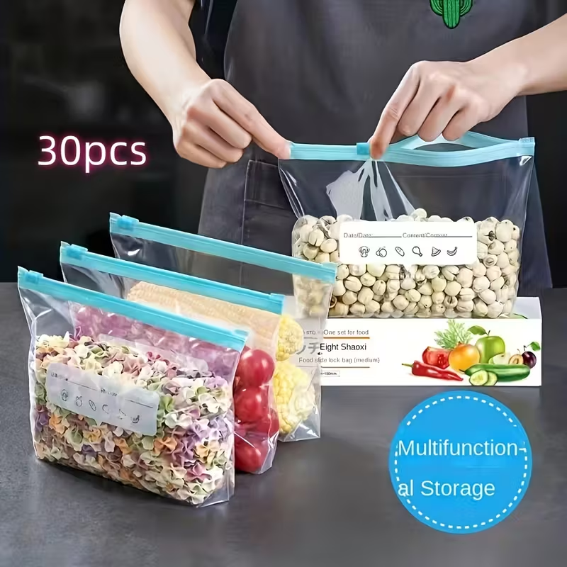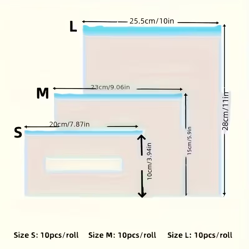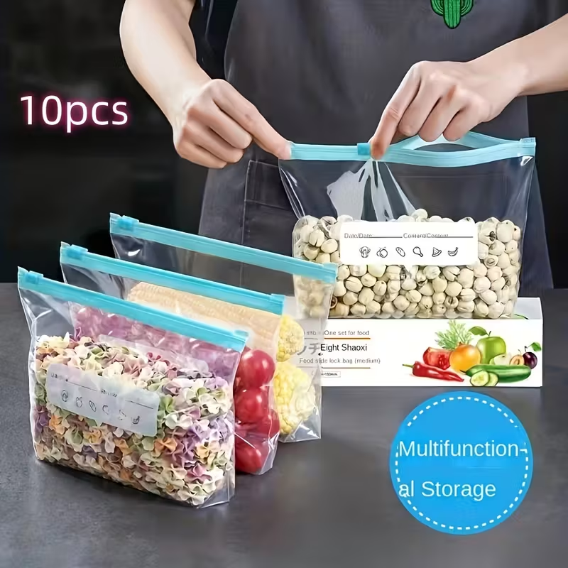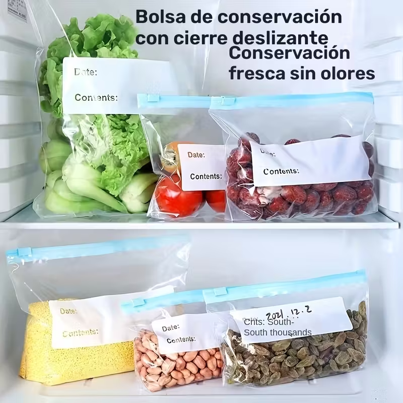 Mantén tus alimentos frescos por más tiempo con este set de bolsas reutilizables con cierre hermético, disponibles en packs de 10, 20 o 30 unidades. Fabricadas con materiales resistentes, antifugas y totalmente seguros para el contacto con alimentos, son ideales para guardar frutas, verduras, snacks, cereales, salsas, líquidos y mucho más.
