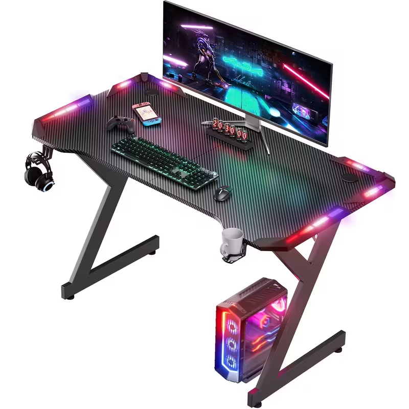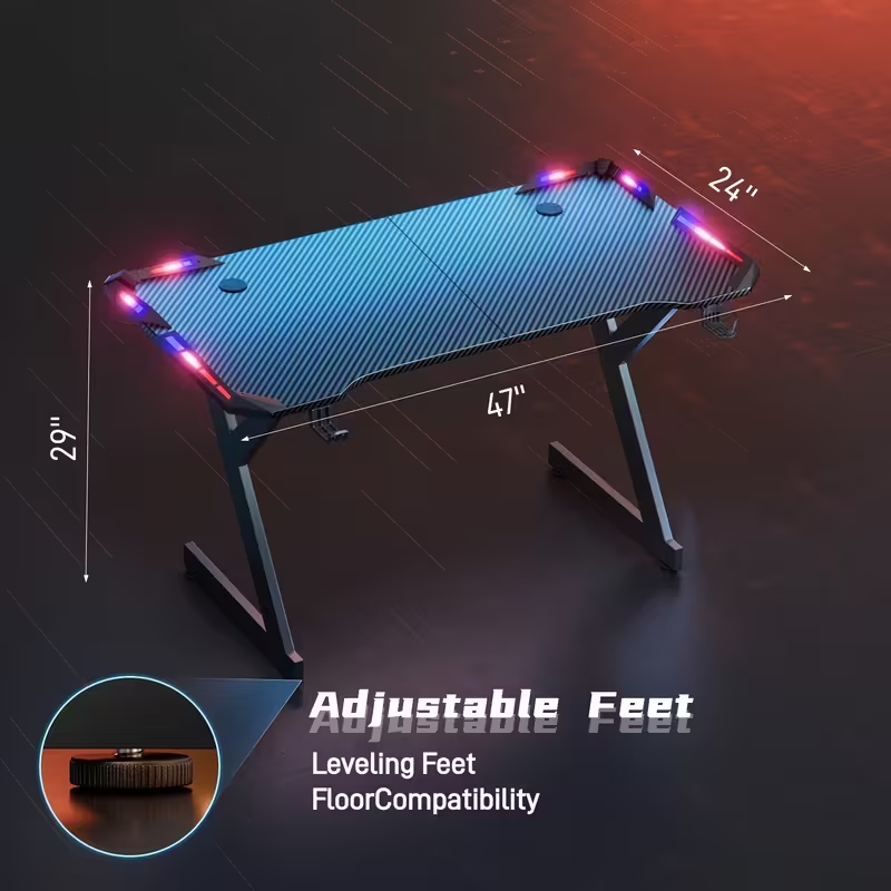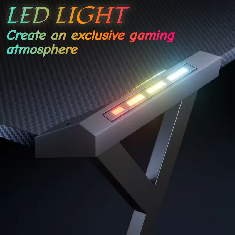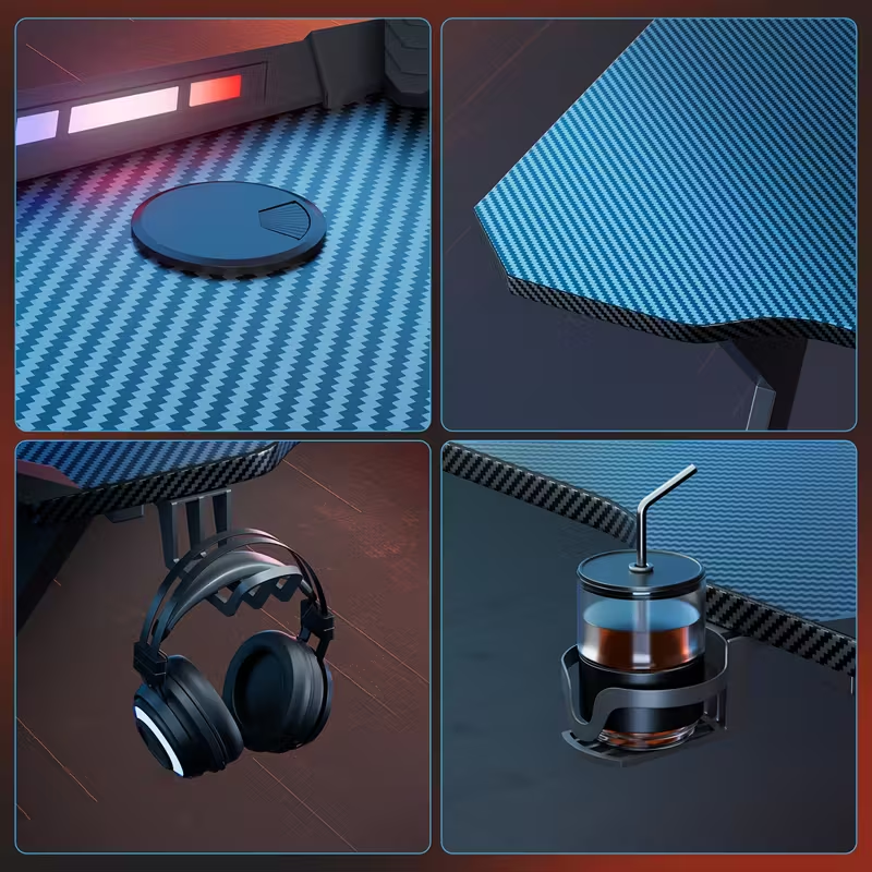 Convierte tu zona de juego en un auténtico centro de control gamer con este escritorio gaming LED de 120 x 60 cm, diseñado para ofrecer máxima comodidad, estabilidad y estilo. Su superficie con recubrimiento de fibra de carbono proporciona una textura antideslizante, duradera y moderna, ideal para soportar tu equipo completo: monitor, teclado, ratón, altavoces y accesorios.