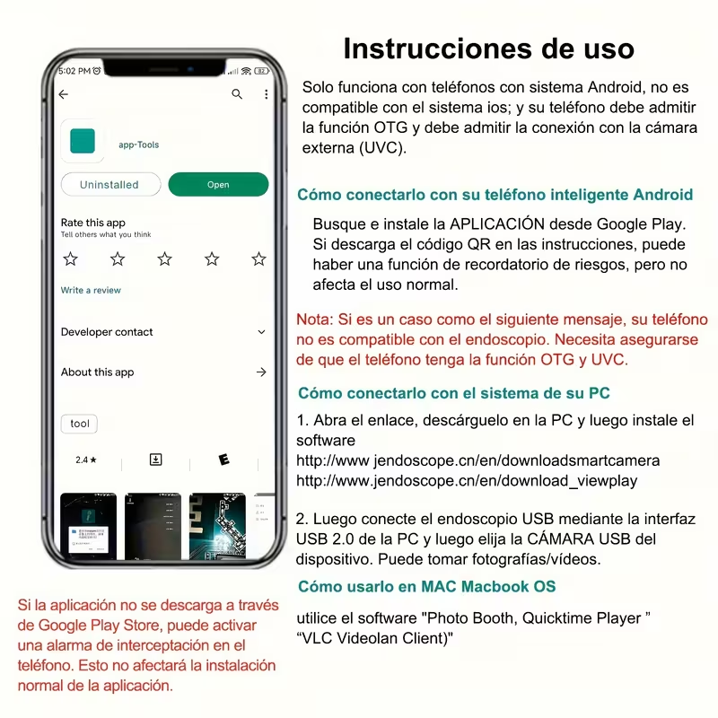 La cámara endoscópica JCBLAON es una herramienta portátil diseñada para inspeccionar zonas de difícil acceso con claridad. Con resolución HD 640x480P y conexión USB/Tipo-C, permite visualizar en tiempo real desde dispositivos Android. Ideal para revisar motores, tuberías, instalaciones eléctricas y espacios sumergidos. Su diseño ligero, flexible y resistente al agua la hace práctica tanto para profesionales como para uso doméstico.