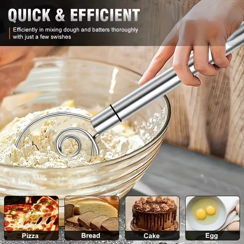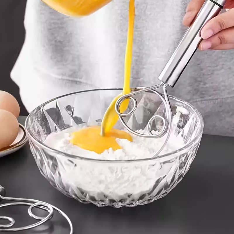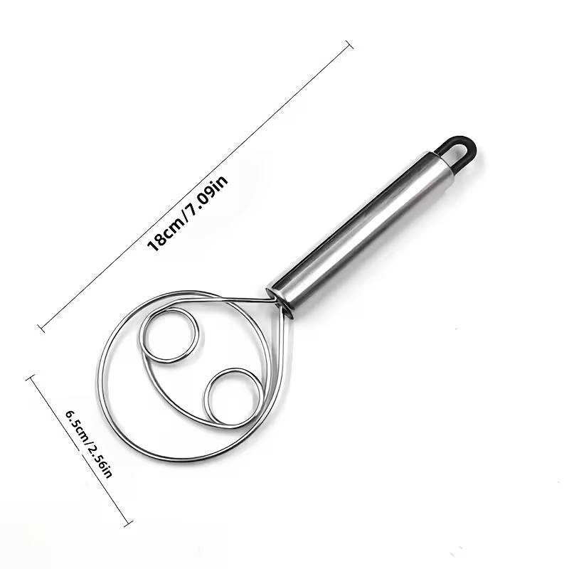 Prepara masas de forma rápida y eficiente con el batidor de masa manual de acero inoxidable. Su diseño con doble orificio permite mezclar ingredientes de manera uniforme, ideal para pan, masas, huevos y otras preparaciones de cocina y repostería. Incluye función de raspador de masa, facilitando el trabajo en la cocina. Perfecto para hogar, restaurantes, food trucks y panaderías.