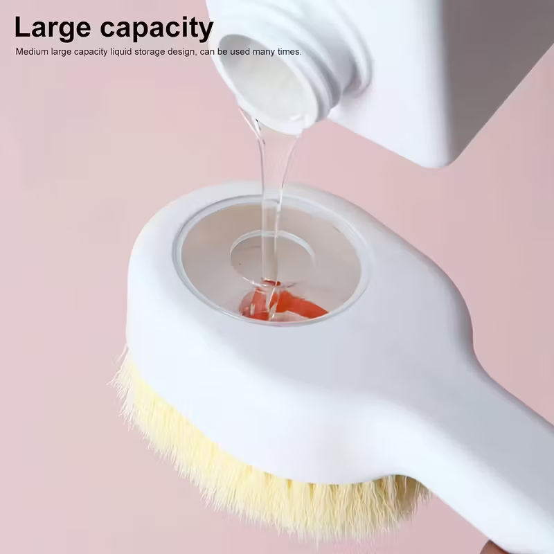 Disfruta de una limpieza cómoda y completa con este cepillo de baño suave con mango largo, diseñado especialmente para alcanzar y frotar la espalda con facilidad. Incluye depósito para líquido de baño, permitiéndote aplicar jabón directamente mientras te duchas o bañas. Su diseño ergonómico y cerdas suaves aseguran una experiencia de baño efectiva, cómoda y delicada con la piel.