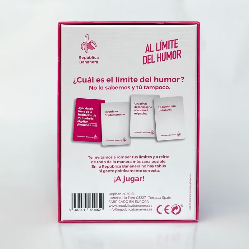 Disfruta de Al Límite del Humor, un juego de cartas de humor negro diseñado para amigos, parejas y familiares que disfrutan de la diversión sin límites. Este juego, parte de la serie REPÚBLICA BANANERA, promete risas garantizadas en cada partida, convirtiéndose en el regalo perfecto para el Amigo Invisible o cualquier ocasión especial.