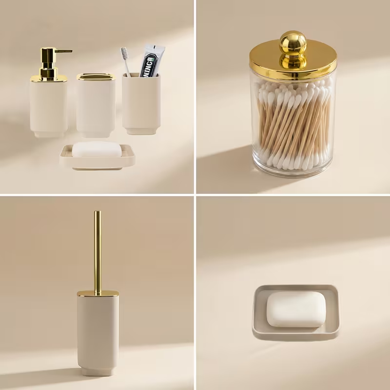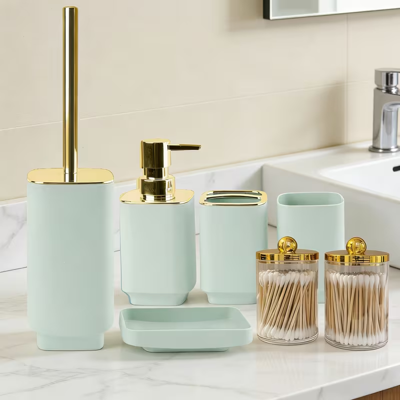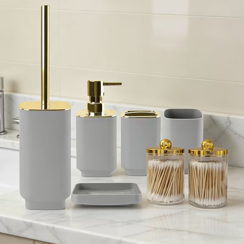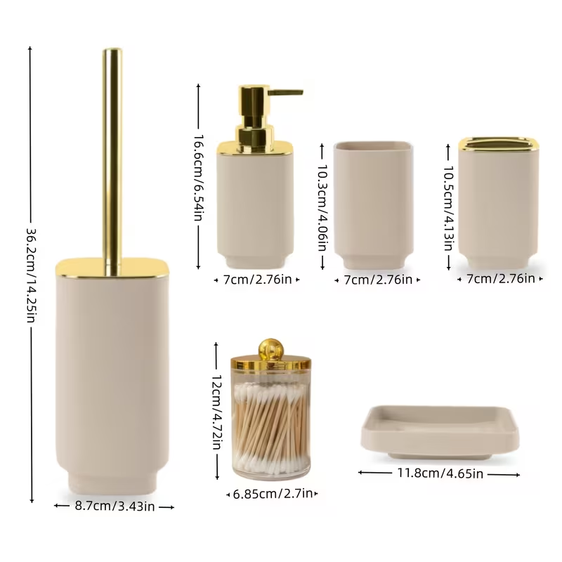 Dale a tu baño un toque moderno y elegante con este kit de baño de lujo de 7 piezas. Diseñado con cuerpo de plástico resistente y detalles de acero inoxidable con acabado dorado, combina estilo y funcionalidad para mantener tu baño organizado. Incluye accesorios de aseo, cepillo para inodoro y recipientes de almacenamiento, creando un conjunto completo ideal para lavabos, duchas y espacios de baño. Perfecto para quienes buscan organización y decoración sofisticada en el hogar.