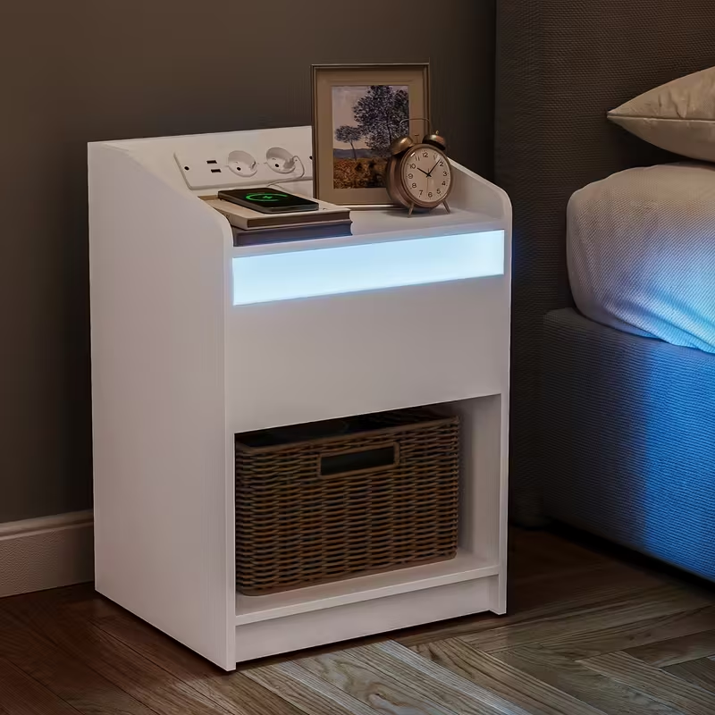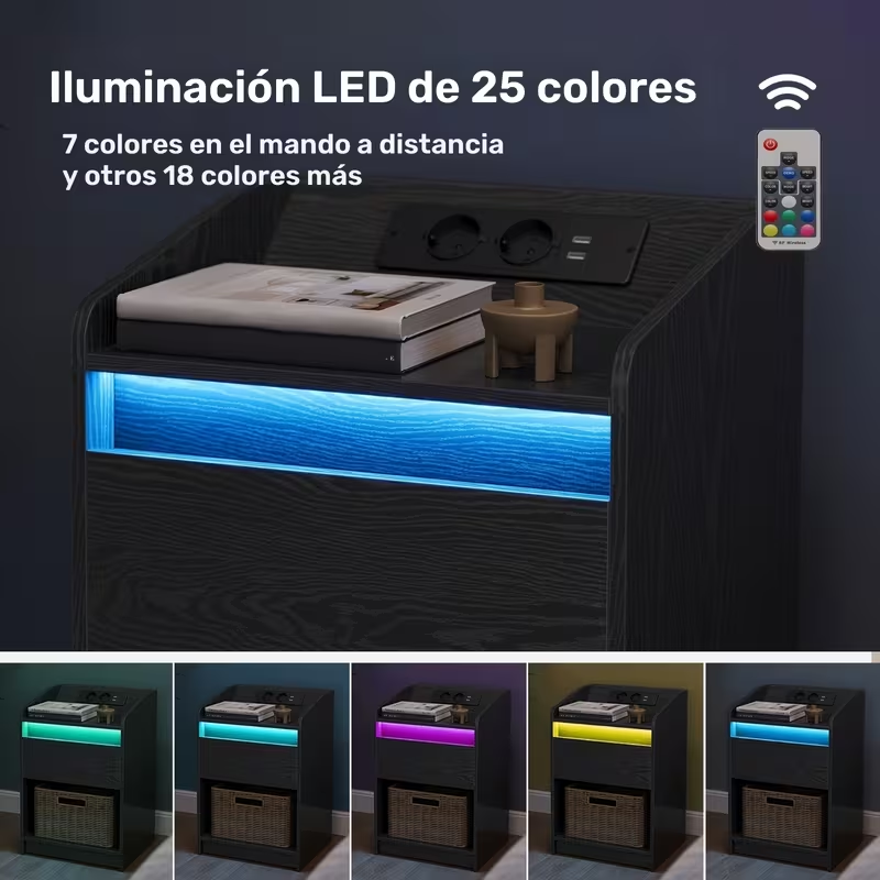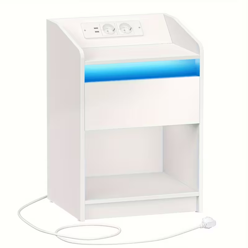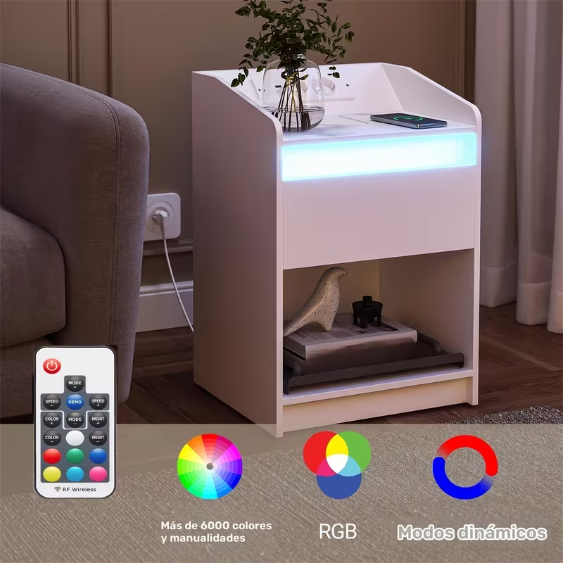 La Mesa de Noche con Iluminación LED es el complemento perfecto para tu dormitorio o sala de estar. Combina estilo moderno y funcionalidad, ofreciendo una estación de carga integrada con puertos USB y toma de corriente para mantener tus dispositivos siempre listos. Su cajón de almacenamiento espacioso y la iluminación LED ambiental crean un entorno cálido, práctico y elegante.