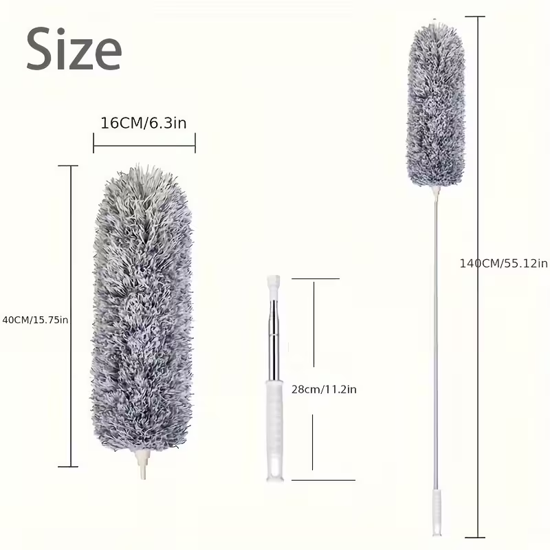 Su mango extensible de metal robusto y su empuñadura ergonómica antideslizante garantizan comodidad y durabilidad. Además, su diseño compacto y plegable permite guardarlo fácilmente, ocupando el mínimo espacio. Ideal para hogares, oficinas, apartamentos o vehículos, este plumero es reutilizable, ecológico y fácil de mantener.