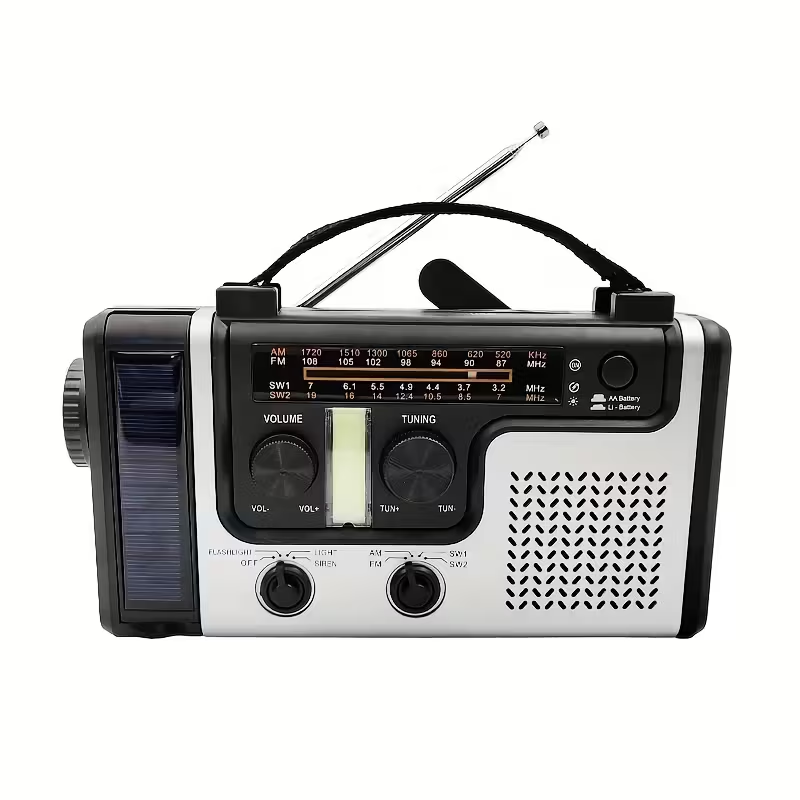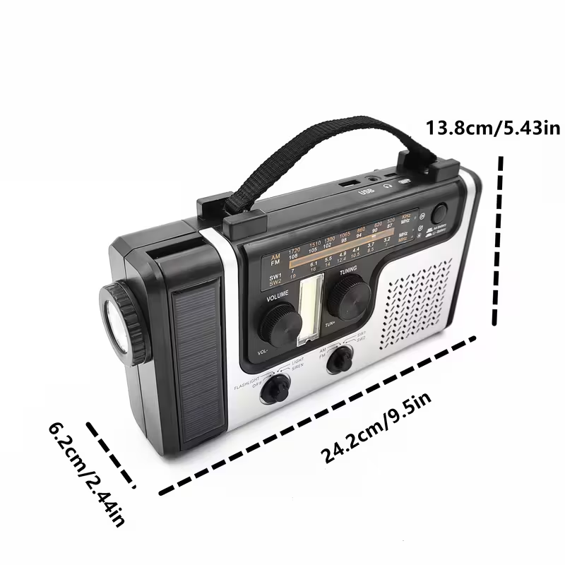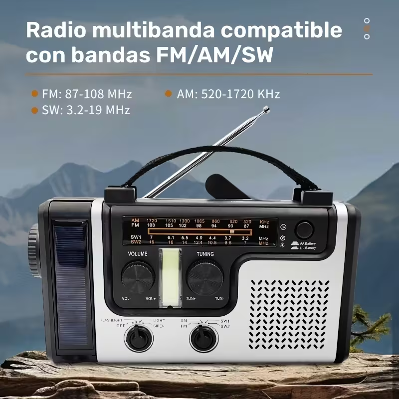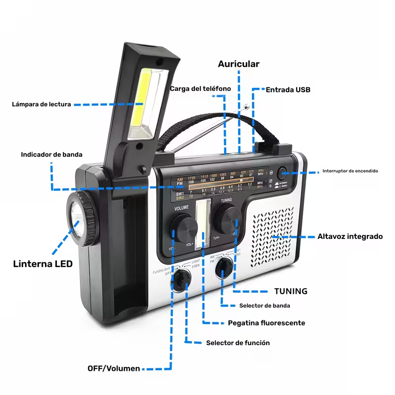 Además de ofrecer recepción de radio clara en múltiples bandas, incluye una linterna LED de alta potencia, lámpara de lectura, alarma de emergencia y puerto USB para cargar teléfonos móviles u otros dispositivos. Su diseño compacto y resistente la convierte en el accesorio indispensable para tu hogar o mochila de supervivencia.