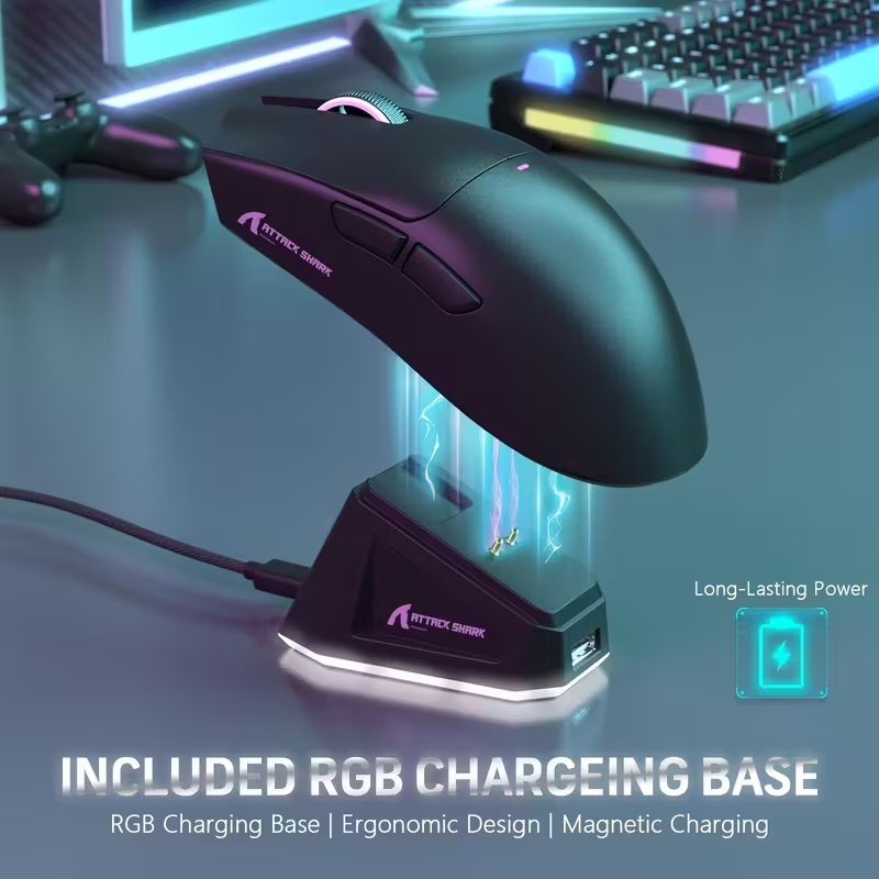 El X11 destaca por su triple modo de conexión (2.4G, Bluetooth y USB-C cableado), lo que te permite adaptarlo a cualquier situación: gaming competitivo, trabajo o movilidad. Su base de carga magnética RGB no solo facilita la recarga, sino que añade un toque visual espectacular a tu setup.